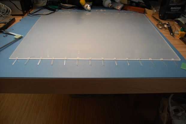 Para comenzar, coloque un pedazo de cinta scotch o cinta de embalaje en un lado de la hoja, a lo largo de los bordes con muescas de LED.