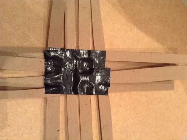 Comenzar a entretejer las tiras de cartulina en forma de cuadrícula. Uno más, uno bajo. Una vez que teje juntos todas las tiras de cubierta un lado del patrón en cinta.