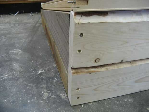 Hemos utilizado tornillos de madera, un taladro eléctrico y una plaza para mantenernos alineados. Porque teníamos mucho material más fuerte y más grueso de lo estructuralmente necesario no utilizamos ningún refuerzo en las esquinas de nuestra caja. Puede que dependiendo de la resistencia de sus materiales.