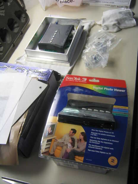 El visor de Fotos Digital de SanDisk es básicamente una pequeña caja negra con 4 ranuras en la parte frontal a aceptar diferentes tipos de tarjetas de memoria de cámaras digitales. Meter en la tarjeta de memoria, conectar el vídeo compuesto o s-video a la tv y encenderlo. El dispositivo reproduce automáticamente una presentación de diapositivas de tus fotos, y no tienes que hacer una cosa. Esto es realmente muy útil para este proyecto.