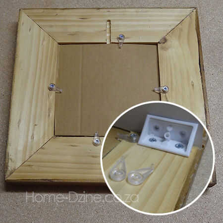 El vidrio fue cabido, agregó la foto insertada y un pedazo de cartón como relleno. Para mantener todo en su lugar clips de cristal fueron atornillados a los lados del marco. Encontrarás diferentes tipos de clips de plástico cristal en su ferretería local, usé uno que tiene una pequeña clavija levantada en el extremo que sostiene el contenido dentro del marco.