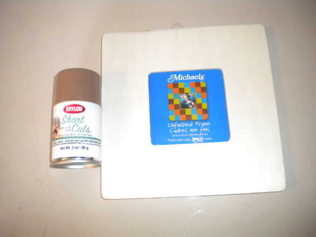 Para la base de este proyecto, se necesita un marco cuadrado y pintura marrón.  He utilizado un marco de madera de la zona de arte de Michaels que costo $1 y una pequeña lata de pintura en aerosol Krylon Brown.