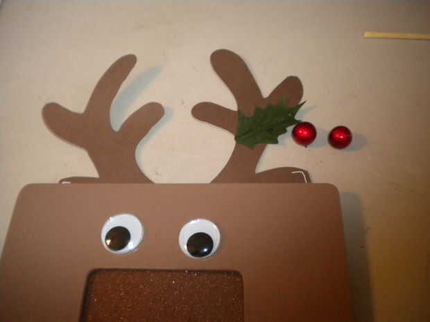 Ahora, la vuelta del marco por lo que pude agregar los detalles en la parte delantera. Usé pegamento caliente para unir dos google grandes ojos y una bola hinchada grande, roja del Departamento de arte. También quería ataviar encima de los cuernos, así que tomé un pedazo de acebo y bayas de un tallo de plástico caliente del Departamento de arte y lo pegué a los cuernos.