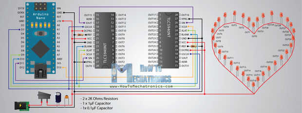 Aquí es cómo los esquemas de circuitos de este aspecto de proyectos. Así que utilizando el Arduino Nano y el TLC5940 ICs puede controlar todos los 32 LEDs. Necesita pocos componentes adicionales, dos capacitores de desacoplamiento y dos resistencias de limitación de la corriente del TLC5940. Puede encontrar más detalles de cómo conectar y usar este IC con el Arduino en mi particular Tutorial TLC5940 y Arduino.