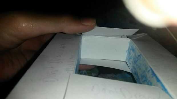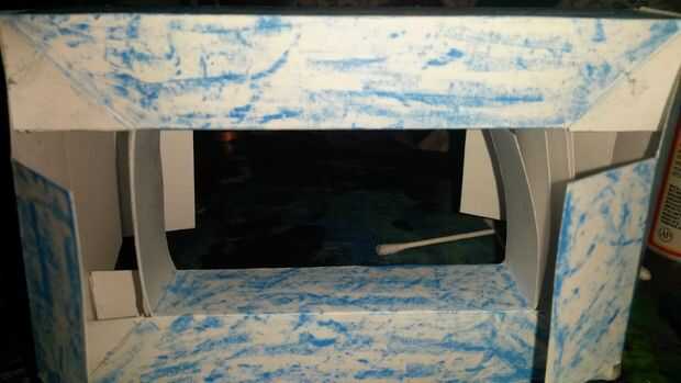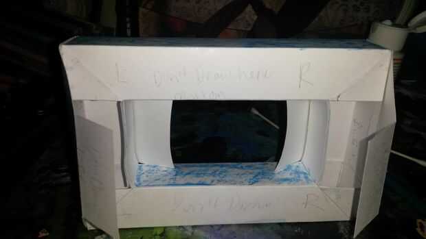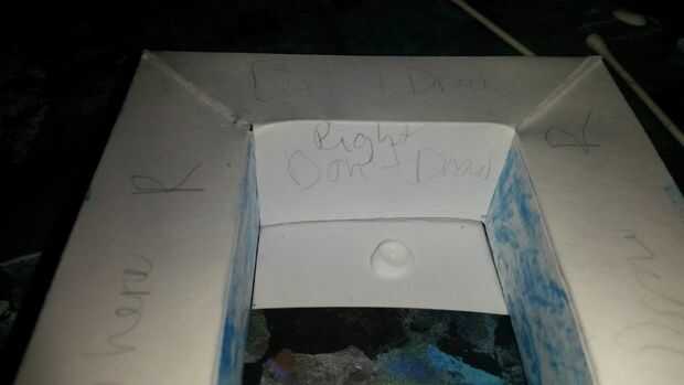 Ahora solo tienen dos aletas más pegamento abajo en el lado derecho y lado izquierdo. Estas son en el centro del cuadro por lo que pueden ser un poco complicados llegar, pero porque ya pegadas las aletas puede ejercer presión sobre las aletas para encolado sólo empujando. Así que comienzo con la adición de pegamento a la zona se muestra en la foto 8, luego empuje la tapa que viene de la parte delantera del bastidor (lado blanco en las fotos arriba) hacia abajo en su lugar. Agregue el pegamento a la parte inferior de su aleta centro pasada que proviene de la parte trasera del marco y empuje esta hacia arriba en la aleta a encolar. Como se ve en la foto 9. Repetir este proceso en el lado derecho del marco.