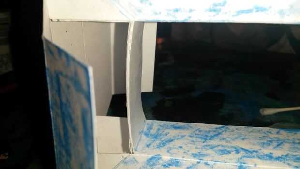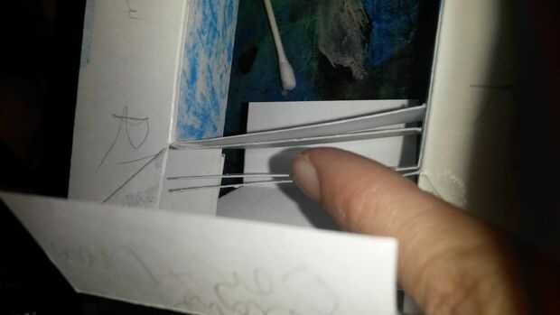 A continuación agregue el pegamento a las solapas triangulares que previamente pegado en su lugar y pegar el borde del marco de estos rincones. Hacer primero como se ve en la foto 4 y 5, los lados traseros de la mano izquierda y mano derecha y girar el marco y coloque el frente como se ve en las fotos 6 y 7.