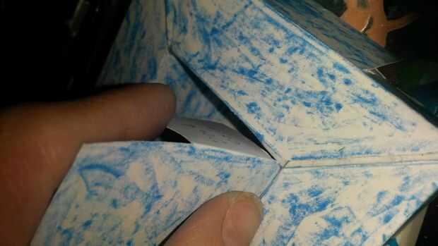 Si no desea pegar las última dos aletas en el interior de la estructura como se muestra en la foto 5. Si le resulta difícil conseguir los dedos ahí puede utilizar el extremo de un lápiz. Pegar las solapas de la izquierda y la derecha en su lugar, momento en el que tuyo debe mirar como lo hace en foto 6.