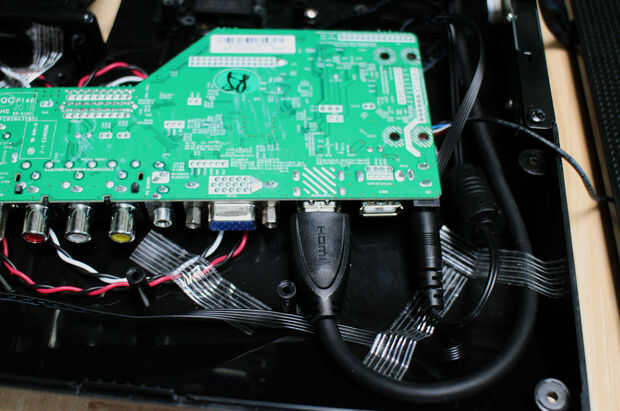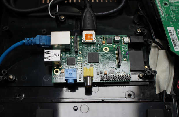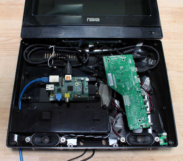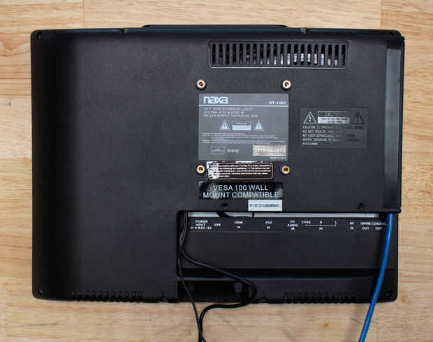 El cable HDMI va entre la TV y el Pi, por lo que puede ser ubicado totalmente dentro de la caja del monitor. Compré el cable más corto podría encontrar (3 pies) y envueltos herméticamente antes de conectar los extremos y asegurándolo con cinta. También de enchufados en el poder para el monitor de energía para el pi y un cable ethernet (o si usas wifi, el wifi dongle). Libremente con cinta todos los cables en su lugar y cerró la caja.
