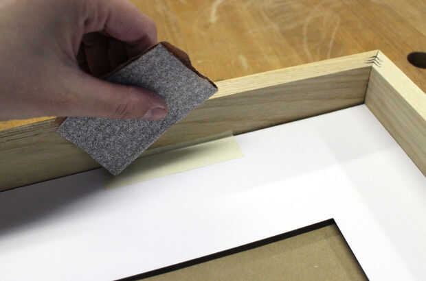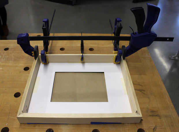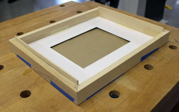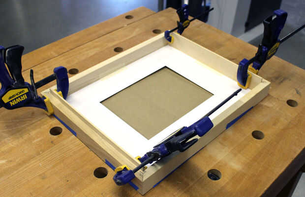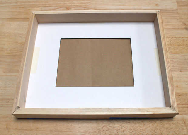 El marco que compré no era lo suficientemente profundo para ocultar los lados del televisor, así que añadido extensiones de madera de balsa en la parte posterior. Corte tiras de la madera alrededor de la televisión y sentarse cómodamente dentro del marco de imagen. Pegar estas en lugar con pegamento para madera y grapas. (nota que cubrí el frente del marco con papel de desecho para evitar la estera blanca sucia cuando estaba en la tienda)