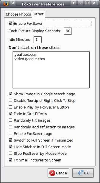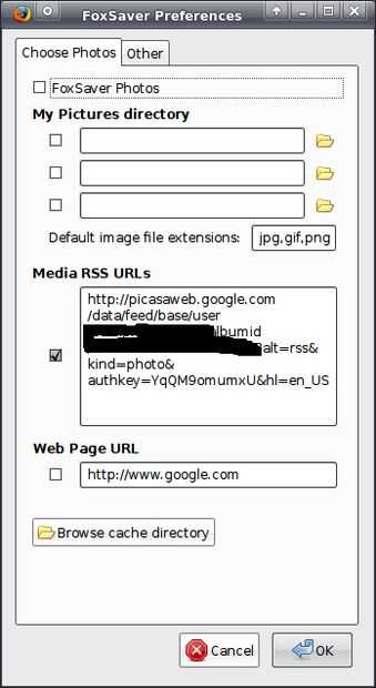 2. instalar el complemento de 'Fox protector'. De forma predeterminada, este tomar imágenes de su propia base de datos. Puede especificar un montón de otros lugares para tomar imágenes de. Utiliza la opción de fuente RSS y había ligado a un album de picasaweb para que puedo agregar a o quitar imágenes desde cualquier ordenador. También configurar el tiempo de espera a 1 minuto (por defecto, parece que no puedo hacer que vaya más bajo o quisiera) y el tiempo de cambio de diapositiva a 180 segundos. Otros ajustes son preferenciales.