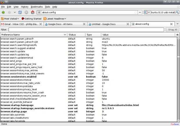 3. en la barra de direcciones, escriba acerca: config--entonces encontrar la browser.sessionstore de ajuste y establecido en false haciendo doble clic en la línea. Esto evitará que windows no deseado mensaje impidiendo la puesta en cada arranque de firefox.