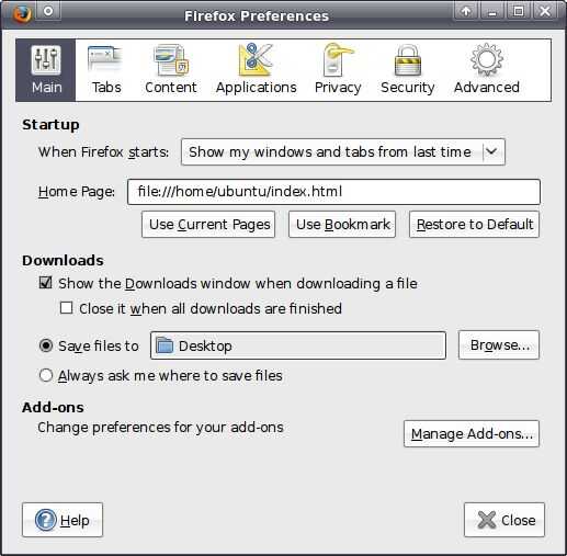 4. crea un archivo HTML y lo colocó en el directorio principal predeterminado para usar como página de inicio de firefox. Abrir luego usa firefox, realizar la página web en Editar > Preferencias. Dice: "Hola, mundo. el pase de diapositivas comenzará en un minuto."