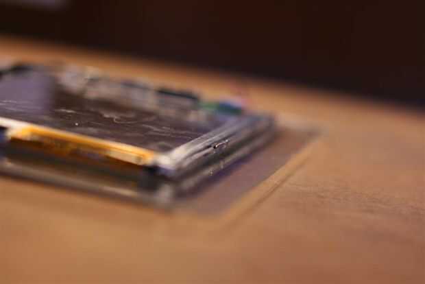 Después de montar ambos elementos, coloque el adaptador de pantalla táctil en la parte interior del plexiglás con cinta de espuma (aproximadamente una mitad de una pulgada de espuma y doble faz cinta a cada lado)