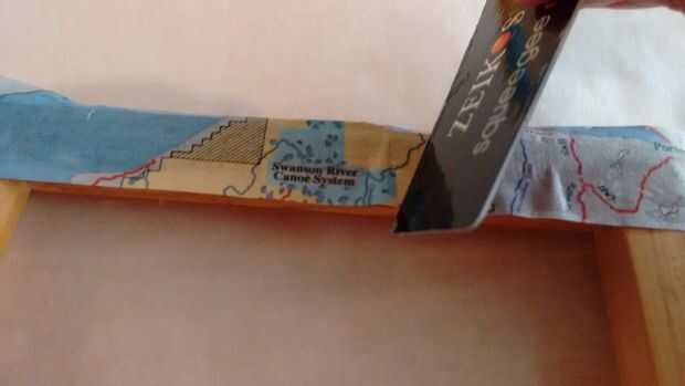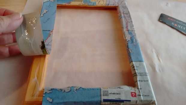 Ahora, con el pegamento y tiras de papel. Considero esta parte muy relajante y agradable. Capa del interior de tus franjas, en el marco que desee, luego pintar más pegamento en la parte exterior. Use su secador poco según sea necesario para alisar suavemente las burbujas o arrugas. Su forma completamente alrededor de su marco de trabajo.