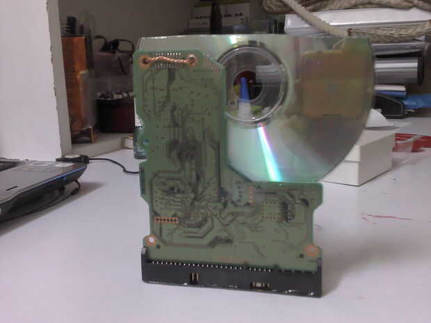 cortar 2/3 del CD, hice 2 agujeros en ella y conectado a la placa del circuito usando el alambre de cobre. Lo que queda del CD super la pegué a la parte inferior de la placa de circuito para apoyarlo y asegurarse de que estaría parado todavía.