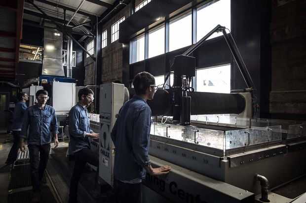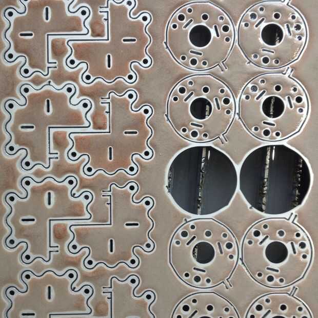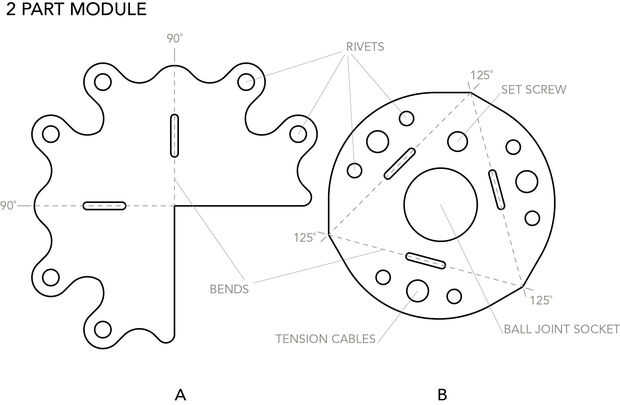 Usé un Omax Waterjet para cortar estas piezas de acero inoxidable calibre 20. Como se muestra en el diagrama, las dos partes (A y B) hacer un cuadrante y 16 partes hacen un todo común (8 de la A y 8 b). Dos características son opcionales debido a lo que estás haciendo. Por ejemplo, los agujeros para los cables de tensión pueden utilizarse el sistema de anclaje o añadir otras cosas como una 'red' dentro de paneles o estructura espacial de su superficie pero.. .it también puede omitirse para cortar más rápido.