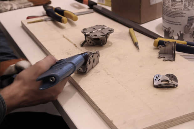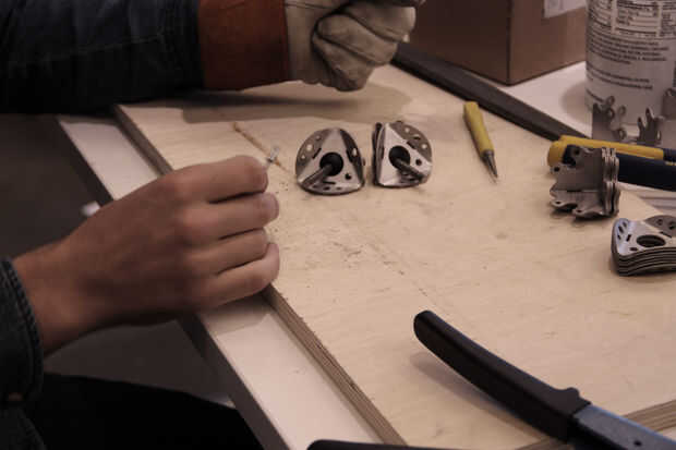 Hacer dos de estos cuadrantes y empezar a remaches del estallido. Seguir añadiendo otro cuadrante hasta que tenga cuatro (una mitad de toda la articulación). Hacer otra mitad y clavar las dos mitades juntas.