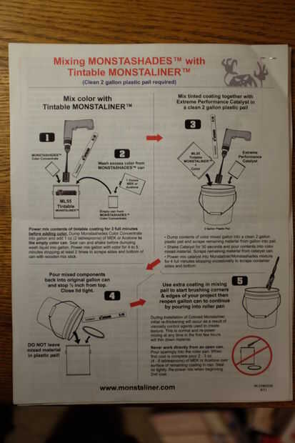 Las instrucciones correctas para mezclar el revestimiento teñibles son en la parte posterior de la guía de instrucciones y son ligeramente diferentes de Monstaliner que las instrucciones para su trazador de líneas negro llano en el frente de la guía. Comencé siguiendo las instrucciones para el trazador de líneas negro llano hasta que di cuenta que había ningún paso para agregar 2 onzas de pigmento verde, momento en el cual encontré las instrucciones correctas en la parte posterior de la guía.