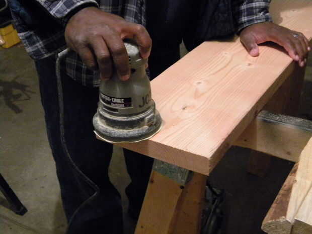 En este punto (o en cualquier momento durante la construcción de la cama), se pueden lijar los tableros laterales de 2 "x 8" y 2 "x 8" pies y cabeza de Comité. Arena para un acabado liso y si hay cualquier relleno de imperfecciones (es decir, agujeros, chuletas, grietas, muescas, etc.) con un relleno de madera pinturas lijables. Además, todos los filos y esquinas deben ser uniformemente redondeados sobre.