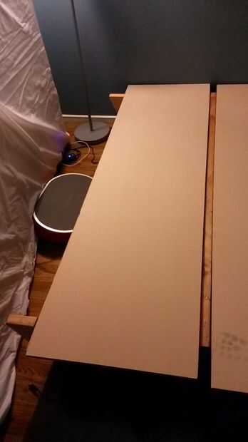 Ahora colocas la placa MDF sobre la base. Tengo mina en 2 pedazos porque un tablero típico es 48 "x 96" mientras que el colchón es 54 "x 75" así que no había ninguna manera de la Junta para ser 1 pedazo. Pero ahora que veo que no me gusta tener la Junta expuesta, habría cortar 48 "x 72" por lo que el contorno del colchón oculta los bordes de la Junta y por lo tanto parece limpiado como se puede ver en la imagen 2.