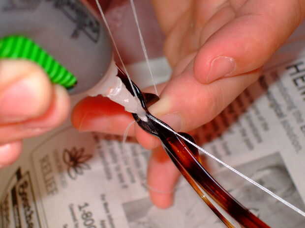 Asegúrese de que no hay burbujas de aire en el hilo de rosca o agujeros. Asegúrese de que hay no hay aire entre la banda de tensión y la articulación de la base--capas de pegamento los dos juntos.