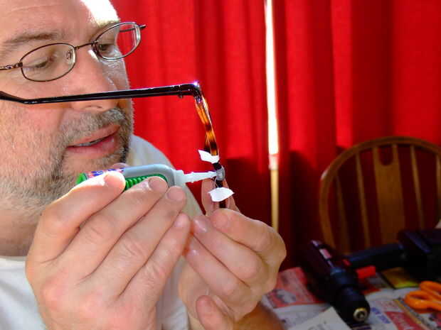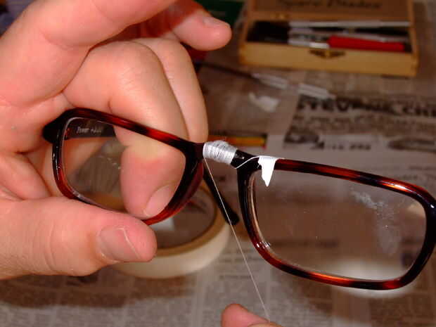 Tome una longitud de hilo y cinta de un extremo a la parte superior del bastidor sobre una lente. Envuelva la rosca cuidadosa y completamente a través del puente de las gafas.