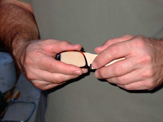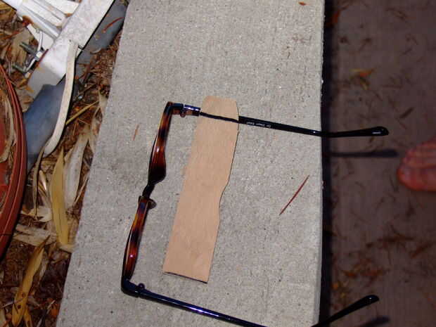 La primera foto muestra lo que quiere: el pedazo de varilla de mezclar encaje entre las piezas laterales de las gafas con una pequeña superposición en el descanso. Esto le permitirá a la rotura de la abrazadera juntos firmemente.