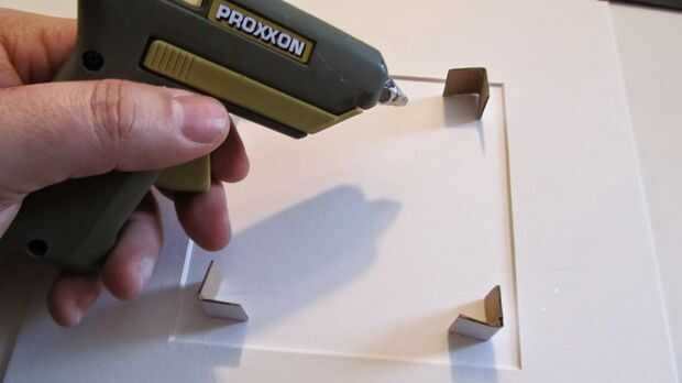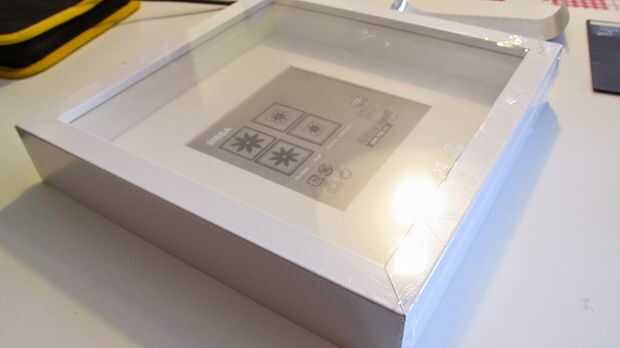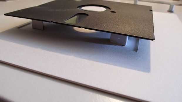 Con el adhesivo caliente fijar en el marco de blanco y pegar el disco Foppy en los 4 soportes.