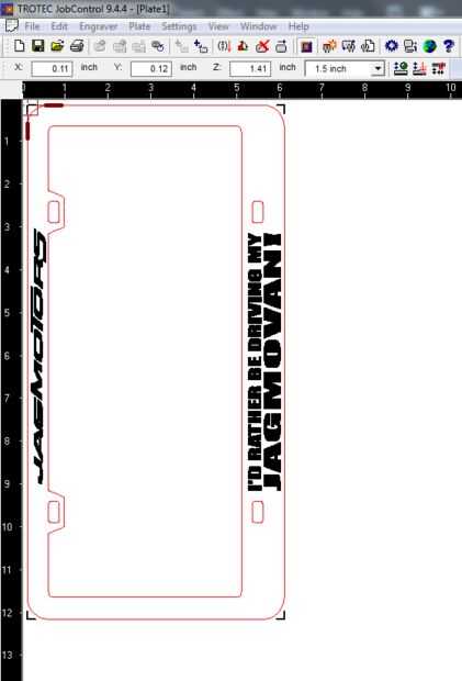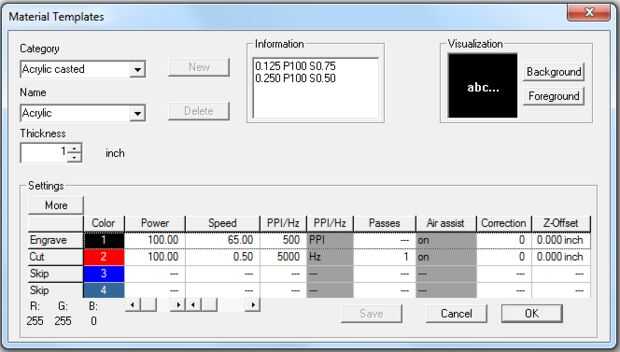 Una vez que el trabajo aparezca en el Control de trabajos, que aparezca el cuadro de diálogo de configuración de Material. Asegúrese de que negro está establecido en grabado (para sus cartas) y rojo se establece en la corte (para el marco). Todo lo demás debe ajustarse para saltar. Creo que tengo mejores resultados de corte a través de acrílico con la velocidad baja un poco de la configuración recomendada, por lo que este cambio a 0.50%. Puesto que vamos a utilizar la capa de papel en el marco de la placa como un frisket para posterior pintura, necesito el láser para extirpar el papel y el acrílico, para disminuir así la velocidad a 65%. Potencia (100% en ambos casos) y potencia/frecuencia (PPI 500 y 5000 Hz) son por recomendaciones.