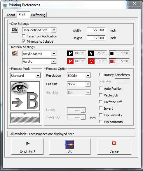 En el cuadro de diálogo Imprimir, seleccione Preferencias. Asegúrese de minimizar al tamaño del trabajo es seleccionado y los ajustes iniciales del Material será "Acrílico fundidas." Seleccione Aceptar, luego volver al cuadro de diálogo Imprimir y esta vez seleccione Imprimir.