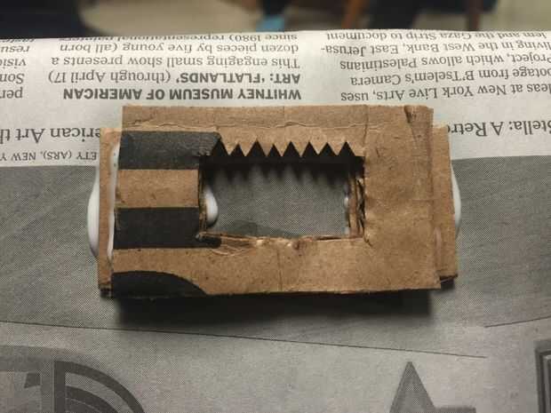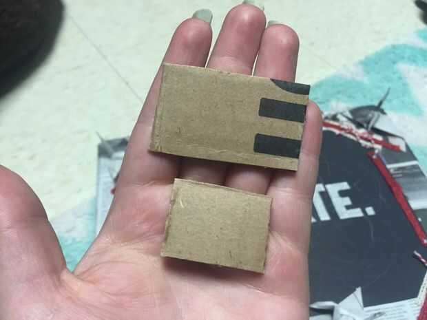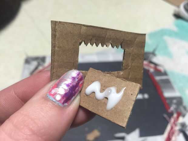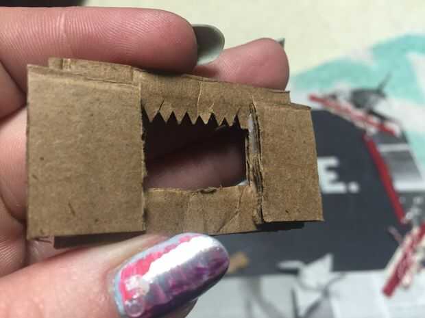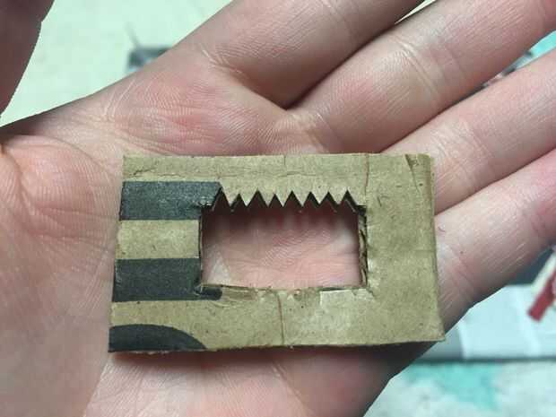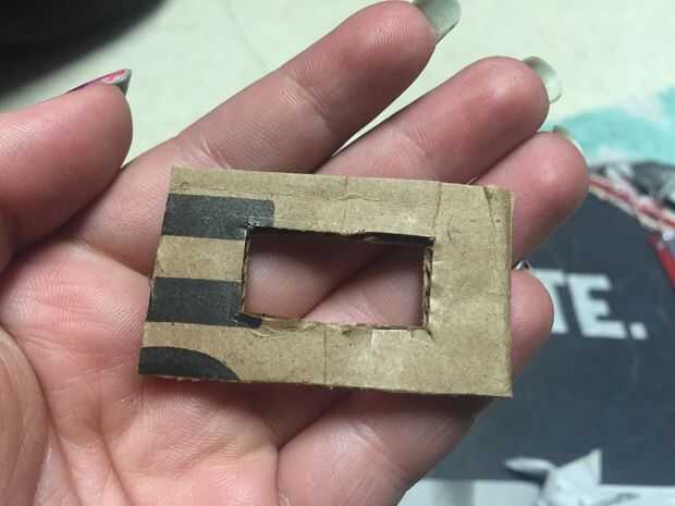 Cortar dos piezas rectangulares o cuadradas de cartulina, uno sobre mitad del tamaño de una tarjeta de visita y la mitad del tamaño de la primera. Utilice tijeras o un cuchillo x-acto para cortar el centro de la pieza grande de cartón y luego cortar dientes triangulares longitudinales a lo largo de un borde (esto será la parte superior de su gancho).