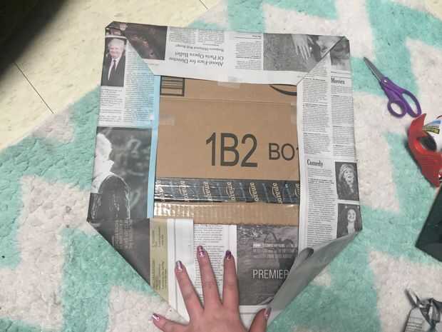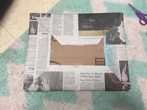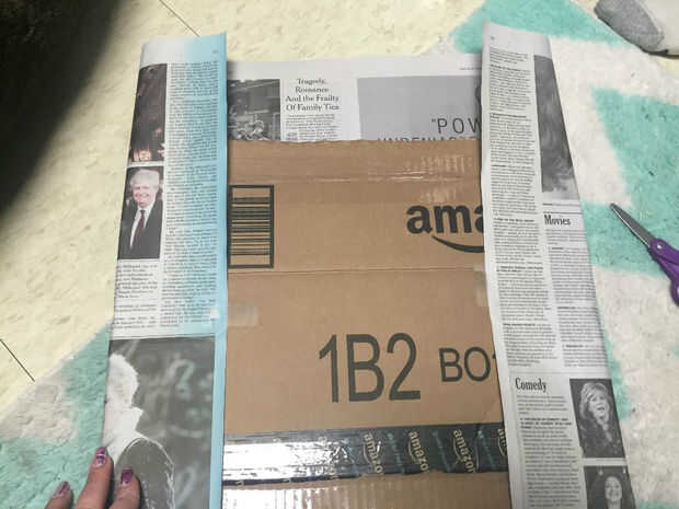 Elegir un pedazo de diario que abarca la totalidad de su marco de cartulina o varios pedazos de diario que hacer el trabajo juntos. Asegúrese de que los pliegues que voy poniendo en el periódico (como se ve en las fotos) terminan en la parte posterior del marco, Dónde está el pedazo de cartulina de refuerzo.