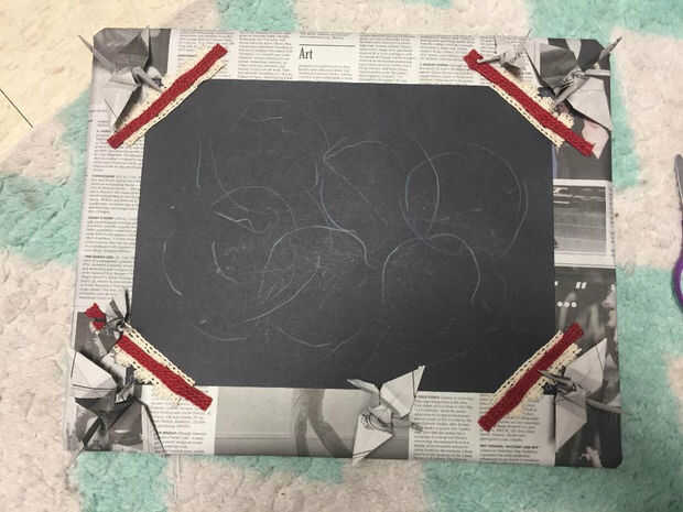 Para la segunda parte de la decoración del marco, utilicé periódico origami grúas como acentos. Puede ver un tutorial simple, fácil de seguir, 6 minutos a continuación: