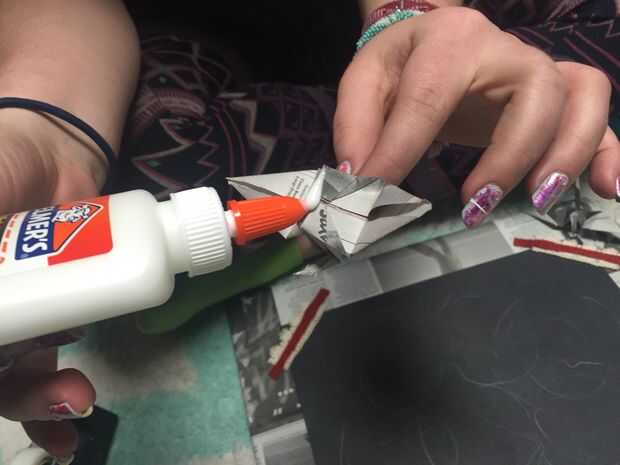 Una vez que haya hecho sus grullas de papel (he hecho siete de varios tamaños), utilice una cantidad generosa de pegamento de Elmer a lo largo del pliegue de la parte inferior de sus grullas de papel para asegurarlos a la estructura en lugares de su elección. Para mantener las grúas coloca la forma en que desee (de pie, inclinarse, etc.), el lugar una pequeña bola de periódico debajo de cada ala para estabilización mientras se seca. Asegúrese de que la estabilización pedazos de periódico no toquen el pegamento mojado!