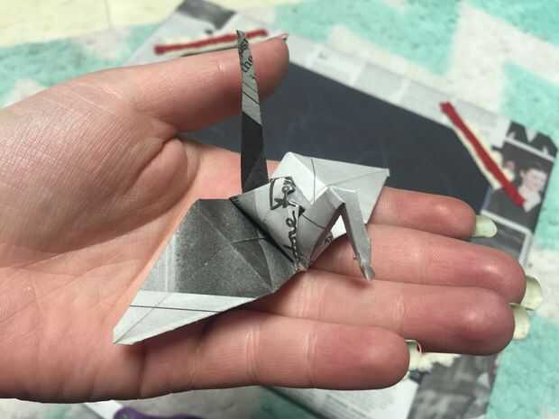 Nota: Prepare sus cuadrados de periódico haciendo un corte longitudinal en una página, doblando la esquina la corte para hacer una plaza y cortando la Plaza. Hice mis grullas de papel con un cuerpo más que en el tutorial. Para lograr este look, sujete cada ala de la grúa cerca del cuerpo con el pulgar y poco a poco y suavemente tire hacia el exterior en las alas. El cuerpo poco a poco se "infle" y aplanar en la parte superior. También puede soplar una pequeña ráfaga de aire en el orificio en la parte inferior del torso de la grúa para que se inflen.