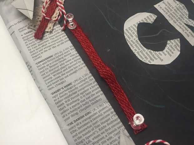 Usar clavos para fijar longitudes de cadena a los bordes izquierdo y derecho (y superior e inferior) de su arte si lo desea. Las tachuelas son capaces de empujar un poco por la parte posterior de la cartulina, use unos cuadrados pequeños de cartón y un poco de pegamento de Elmer para cubrir los espacios donde las tachuelas se asoman por la parte posterior.