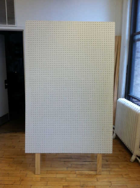 Pone de estos tableros con bisagras, 14 pies en el suelo duro de superficie, paralela y de lado a lado, con las bisagras hacia abajo. El espaciado entre estas tablas depende el aspecto deseado y la estabilidad de su marco. Si sus tableros son de 48" de ancho (como se muestra), entonces usted probablemente querría los tableros de madera espaciados sobre 3 pies aparte, dentro de borde de borde en el interior. Cuanto más lejos aparte las tablas, la estabilidad más lateral tendrá el marco acabado. Un interesante experimento de diseño (no mostrado aquí) sería tener las placas de bordes al ras con los bordes del pegboard. ¿Quién quiere probar?