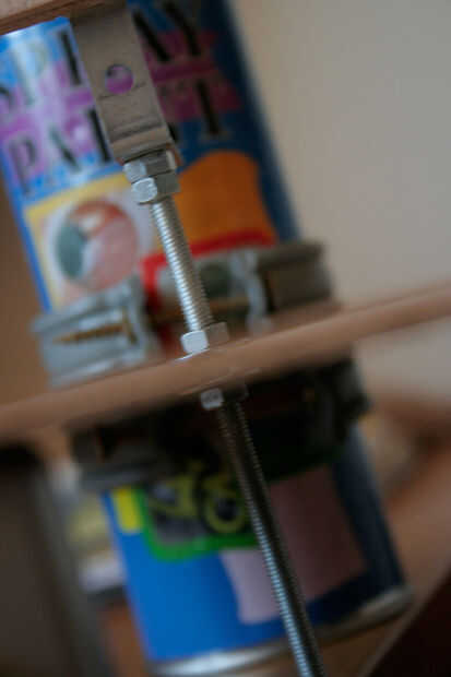 Deslice el orificio en el woodenplate alrededor de la spraycan hasta que descanse sobre la abrazadera de tubo de lluvia. Tome la segunda regenpijpbeugel y apretar la placa de madera entre estos dos. Asegúrese de que hacerlo de una manera que la placa de madera permanece en su lugar y no pueda rotar.