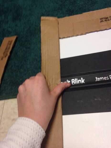 4) asegurándose de que el marco se volcó (la parte posterior del bastidor, cartón expuesto mostrando), asegure las piezas de cartón alrededor de la obra de arte. Poner pegamento o cinta en el borde de las tiras; Sujete a sus lados correspondientes, alineando el lado pegado/cinta para el borde exterior del marco.