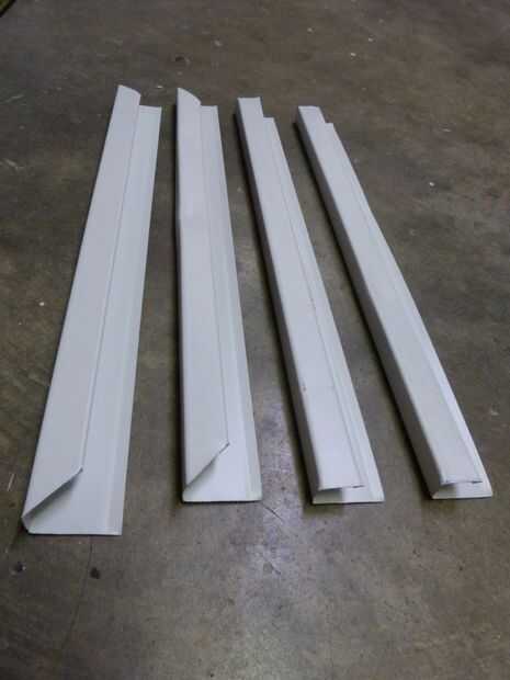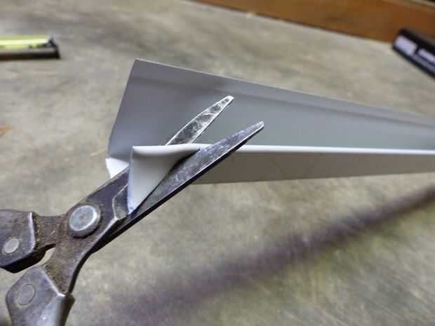 Puse los dos pedazos juntos y había marcada intersección (Foto 2). Dibujó una línea recta desde ese punto hasta el final de la parte inferior del sofito y cortar eso pedazos (Foto 3).