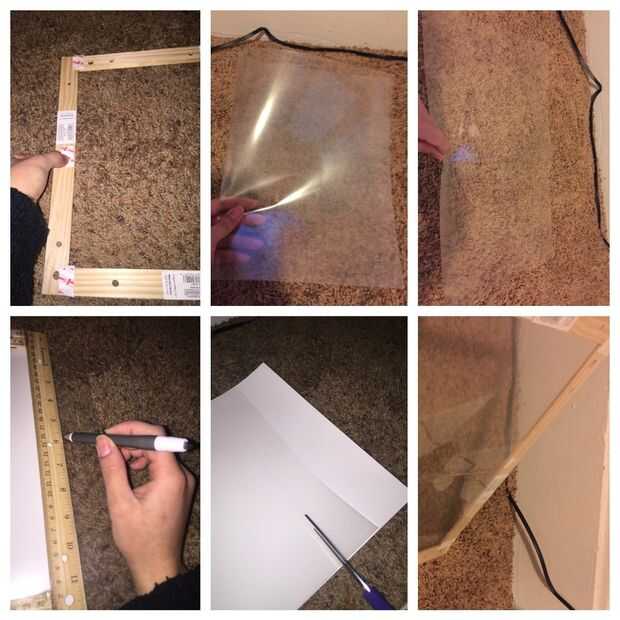 4. Coloque la tapa sobre una hoja en blanco por lo que es más visible. Y coloque el marco sobre la cubierta. Usar un lápiz, trace una línea en la tapa donde el plástico puede ser exceso.