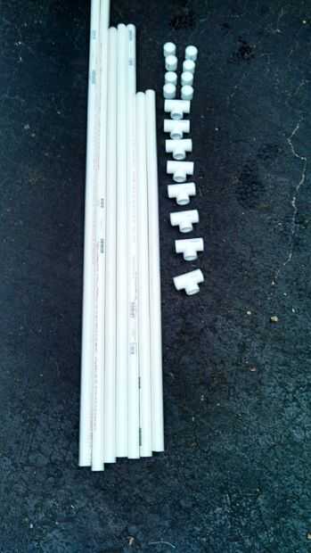 Un par de cosas a tener en cuenta en la tienda de hardware. Usted podría conseguir tres longitudes de PVC de 10', sin embargo deben tener 5' secciones precortadas. Ya que necesitaba dos 5' secciones pasé más de dos dólares y me había guarda 5 minutos de corte. Tienen sus dos longitudes de 10' a cortar secciones de 6' y 4'. Es más fácil para el transporte y tendrás que hacerte cortes menos. También, podría preguntar si desea delgadas paredes o paredes gruesas. Realmente no importa. Delgado paredes es un poco más barato pero también es ligeramente más débil. Fui con fina paredes de mi 10' longitudes y espesor de paredes para mi 5' longitudes. Por último, asegúrese de que todos los conectores son sin hilos. Quiere simplemente deslizarse sobre. Si usted hace su que compra todos 1" PVC y los accesorios usted será fino. La imagen muestra lo que tienes en el inicio de su proyecto (excepto olvidé los conectores 90 grados).