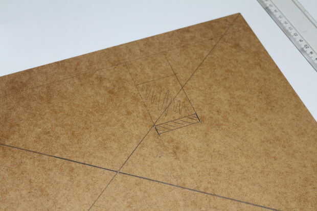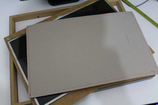 Utiliza una cartulina para medir el tamaño de la pantalla y realizar algunas mediciones para el mejor posicionamiento y búsqueda y marcado donde entrarán los cables debajo de la estructura