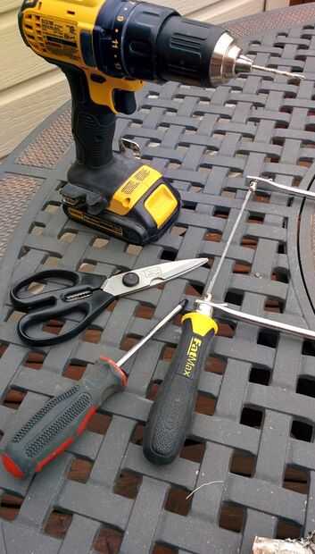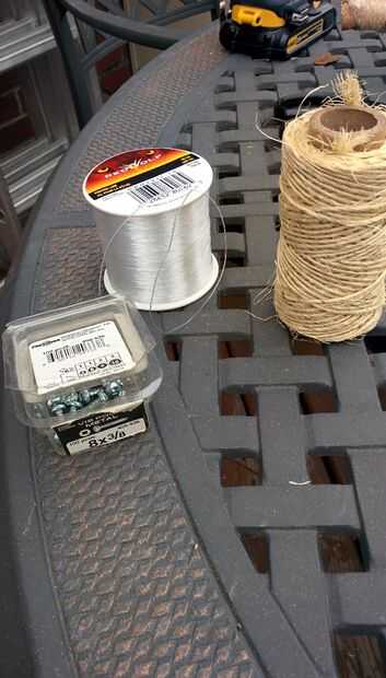 Lo siguiente que necesita es la cuerda para el amarre de esquina, lineas de pesca (tengo un carrete de sobre 60feet, clasificados por 40 libras pescado [cosas tan muy fuerte], por unos $4), caliente pegamento, tornillos pequeños (para sujetar el sedal en la parte posterior del marco), un taladro y un pequeño diámetro broca (suficiente para pasar el sedal a través de él) , una sierra de marquetería (para cortar las muescas donde se unen las esquinas del marco), tijeras y un destornillador.