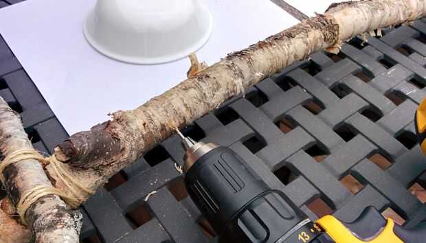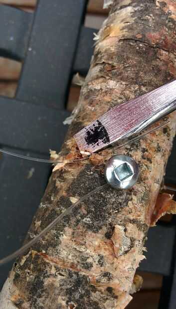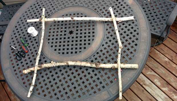 Taladre los agujeros entre las ramas, voltee el marco y colocar un pequeño tornillo justo detrás de ese agujero. Finalizado, el sedal a través de ambos agujeros del hilo de rosca, lazo alrededor de los tornillos y listo.