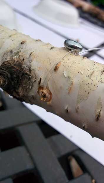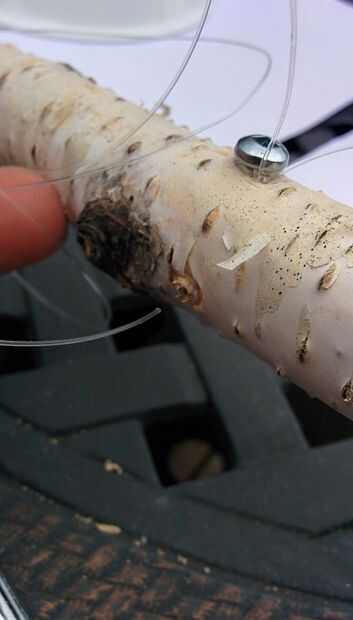Me pregunté por un rato sobre cómo fijar la línea al tiempo que apoyo para las fotos pero tan invisible como sea posible. Una manera era atar alrededor de las ramas, pero me daba miedo que la línea sería finalmente aflojar un poco, que causaría que el nudo no permanecer justo al lado de la rama, alejarse de él, y se hacen más visibles.