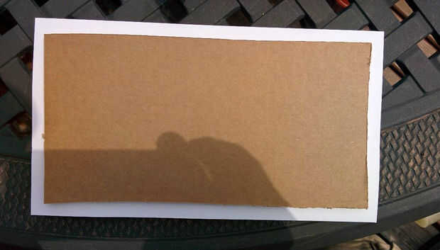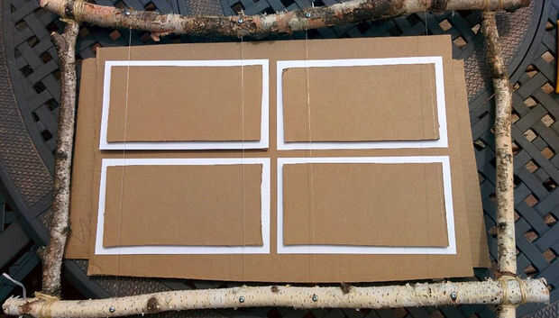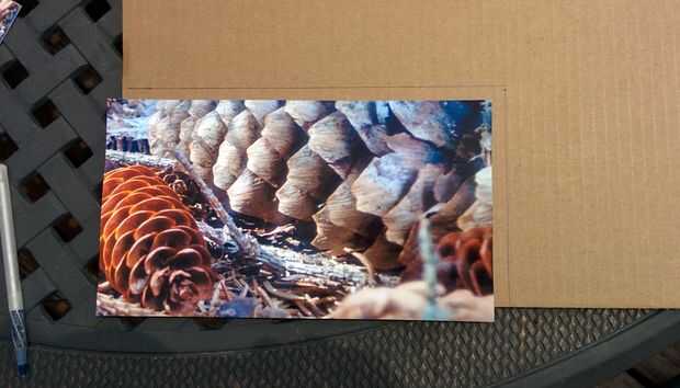 Ahora que el marco esté listo, es tiempo de poner las fotos. Por su propia cuenta, sin embargo, son demasiado endebles para añadir un soporte de cartón. Sólo obtener una hoja de cartón plano, traza la foto a él, reducir el rastro de unos 0.5" en cada lado (para que el respaldo no muestra en la foto) y recortarlo. Trace el cut-out tres veces más y las recorte demasiado.