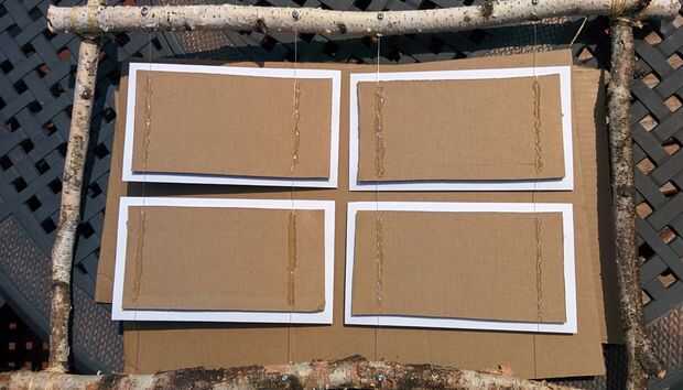 Cuando tienes todas las fotos que adjunta a sus forros, ponen cara en el arreglo que desee, pone el marco (boca abajo) sobre él y utiliza pegamento caliente para fijar las líneas de pesca a la cartulina.