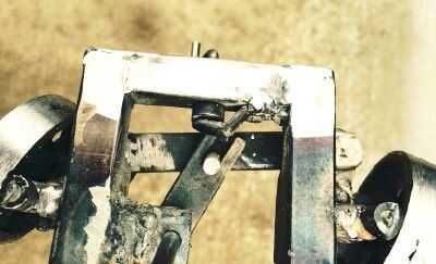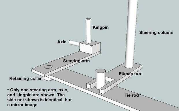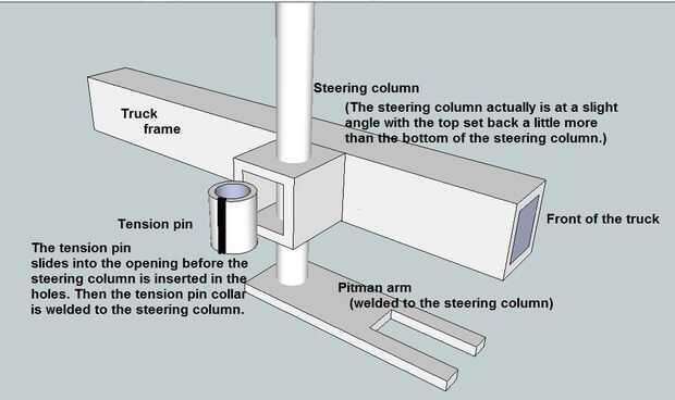 Después me mudé el tirante por detrás de las ruedas delante de las ruedas, cambié de varilla de 3/16 de pulgada para los brazos de dirección para barra de 1/8 x 1/2 pulgada de acero plana. Los pivotes son de varilla de 3/16 de pulgada soldadas en uno de los miembros y pasa a través de un agujero en el otro miembro. Una corta sección de la barra de tensión es soldada en el extremo de los pasadores de pivote y soldado con autógena en el lugar funcione como un collar. Véase el segundo gráfico para más detalles sobre la construcción de la conexión de mando. (En realidad, el tirante es sobre algo que por debajo de los brazos de dirección). Ver el tercer gráfico para más detalles en la columna de dirección de montaje.