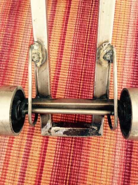 Soldado con autógena un pedazo de tubería cuadrada de 1/2 pulgada en la parte posterior del marco para un espaciador levantar la parte trasera del bastidor para el mismo nivel que la parte delantera del bastidor. Soldado una barra plana en los extremos de esta pieza espaciador y los agujeros de perforado de 3/16 de pulgada a través del cual pasa el eje de 1/8 x 1/2 pulgadas